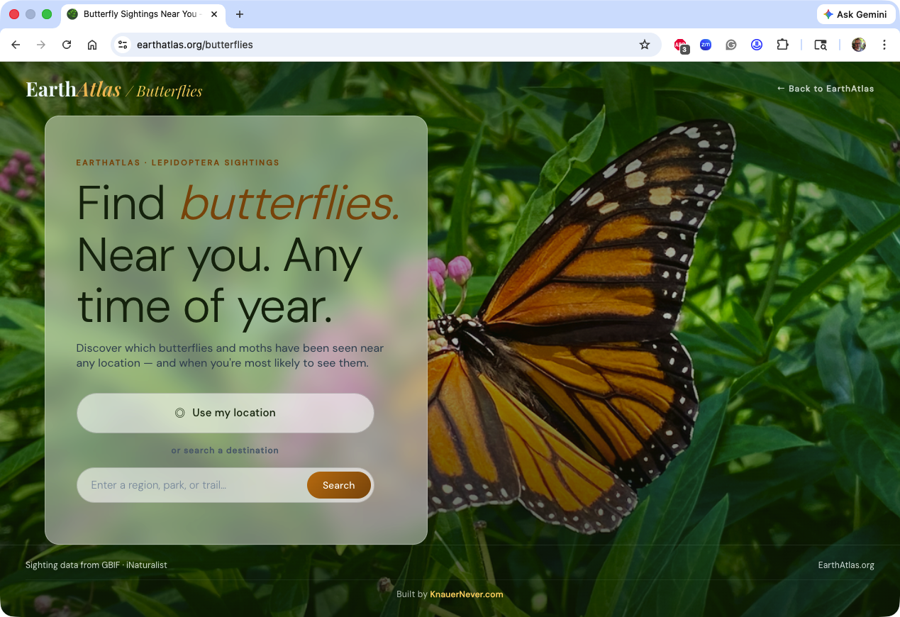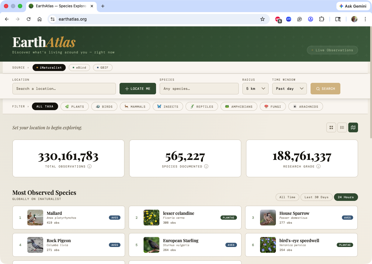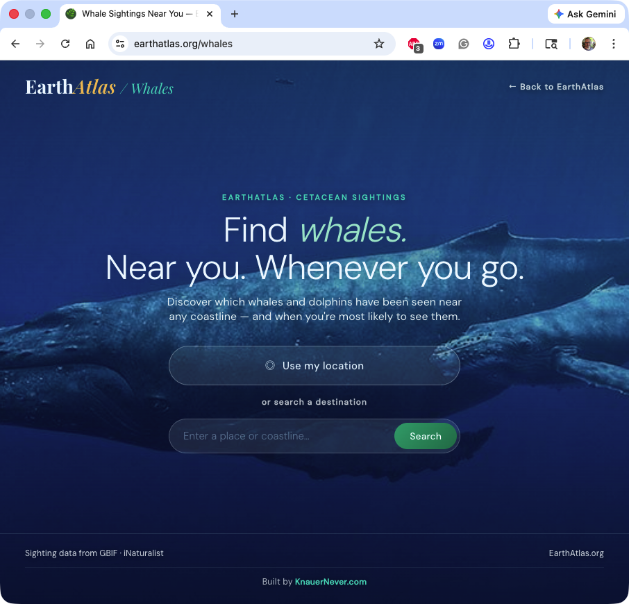 EarthAtlas is a biodiversity exploration platform that lets users discover species living near them — including whales, sharks, and butterflies — by pulling real-time sighting data from GBIF, eBird, iNaturalist, and other sources onto interactive maps. Species-specific subsites offer location-based search, heatmap layers, seasonal patterns, and detailed species cards to help users understand the wildlife around them.